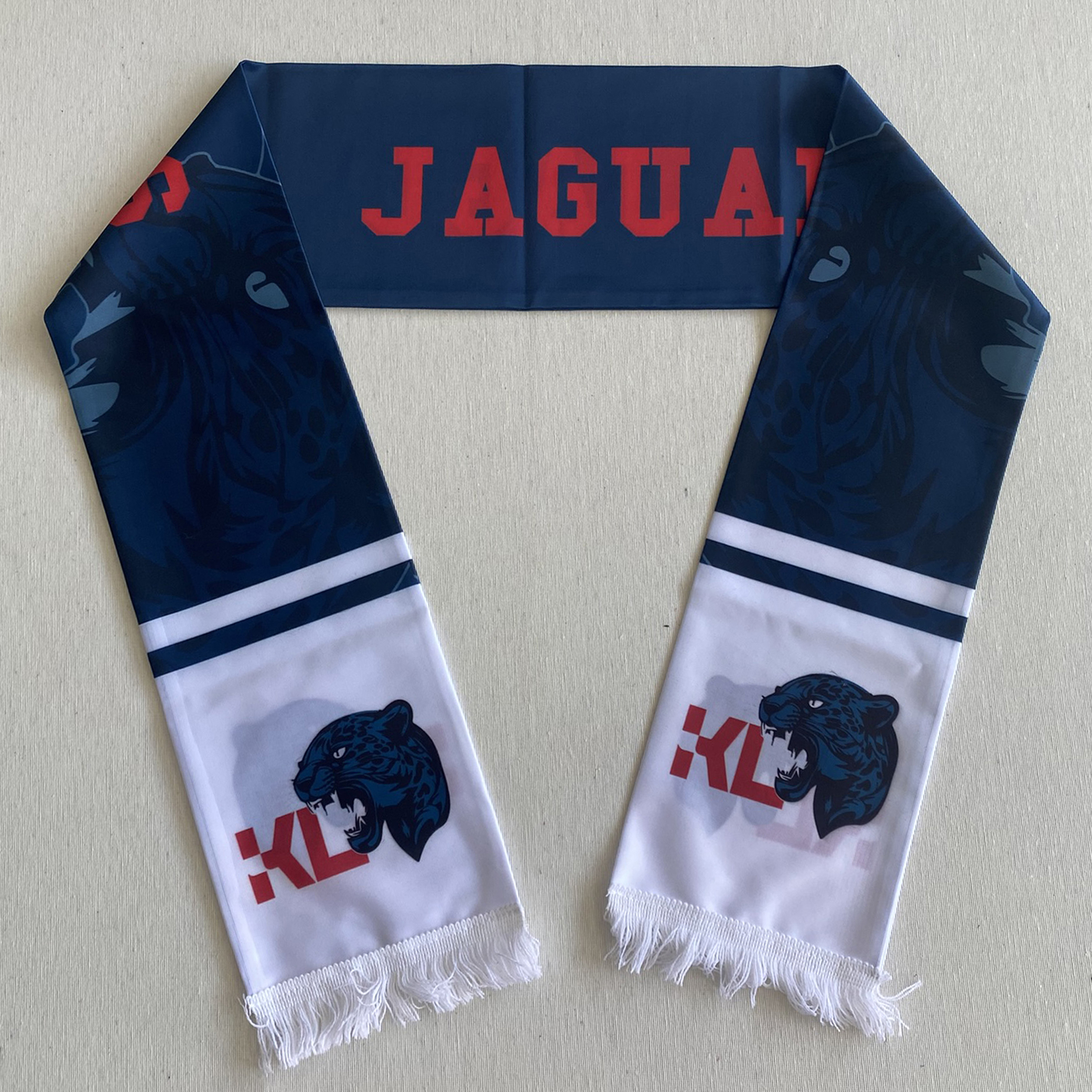 KL Jaguars takımı için özel olarak tasarlanmış, lacivert ve beyaz renklerin hakim olduğu, jaguar logolu ve kırmızı yazı detaylı saten taraftar atkısı. 1. sınıf malzemeden üretilmiş, çift katlı ve püsküllü, yüksek kaliteli baskıya sahip hatıra atkısı.